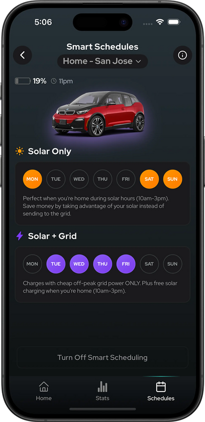 The app will automatically schedule charging during peak solar production hours, maximizing your use of free, clean energy and minimizing grid consumption for even greater savings.