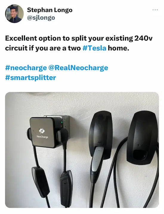 The Smart Splitter plugs into your existing 240V outlet for easy circuit sharing between your appliance and EV OR two EVs.